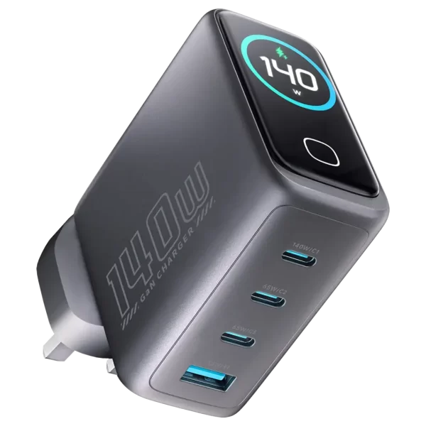 The Powerology Voltflow GaN Wall Charger PD 140W is the most efficient charging setup in town for all your appliances. With USB-C outputs up to 140W max on C1, fast charging is just the recipe for all your smartphones, laptops, tablets, and so on. The PPS output allows it to fast-charge rather smoothly, actually fast, on almost any device. The 3x USB-C and 1x USB-A ports allow you to charge multiple devices at the same time. Intelligent power distribution ensures every device gets an optimum amount of power for safe and efficient charging. The charger supports AI temperature control that keeps it within safe operating temperature in heavy charging mode. Real-time power information is displayed on the TFT screen, complementing the power monitoring, which adds to the convenience. Designed to be foldable and portable, it lends itself well to travel. Providing UK 3-pin plug compatibility, Voltflow GaN Wall Charger offers fast, reliable, and versatile charging anywhere.